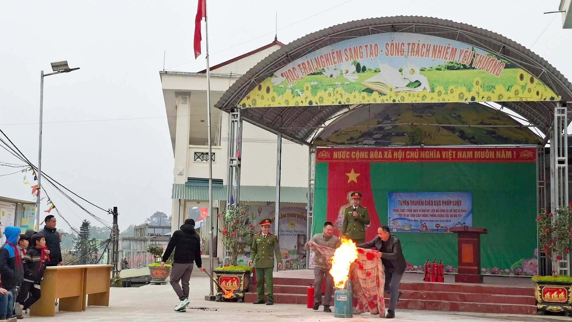 Tại buổi tuyên truyền, lực lượng Công an xã đã phổ biến các quy định của pháp luật liên quan đến quản lý, sử dụng pháo; phòng, chống các hành vi vi phạm pháp luật về vũ khí, vật liệu nổ, công cụ hỗ trợ và pháo. Đồng thời, nhấn mạnh những hậu quả pháp lý nghiêm trọng khi tàng trữ, sử dụng trái phép các loại vũ khí, vật liệu nổ, công cụ hỗ trợ và pháo; hướng dẫn phân biệt pháo hoa với pháo nổ, làm rõ tác hại của pháo nổ đối với bản thân, gia đình và xã hội. Bên cạnh đó, học sinh và giáo viên còn được trang bị kiến thức, kỹ năng về phòng cháy, chữa cháy; cách xử lý tình huống và kỹ năng thoát nạn khi xảy ra sự cố. Nội dung tuyên truyền về trật tự, an toàn giao thông giúp các em nâng cao ý thức khi tham gia giao thông, chấp hành nghiêm luật lệ đường bộ. Chương trình cũng lồng ghép tuyên truyền phòng, chống bạo lực học đường và phòng, chống ma tuý, góp phần xây dựng môi trường giáo dục an toàn, lành mạnh.