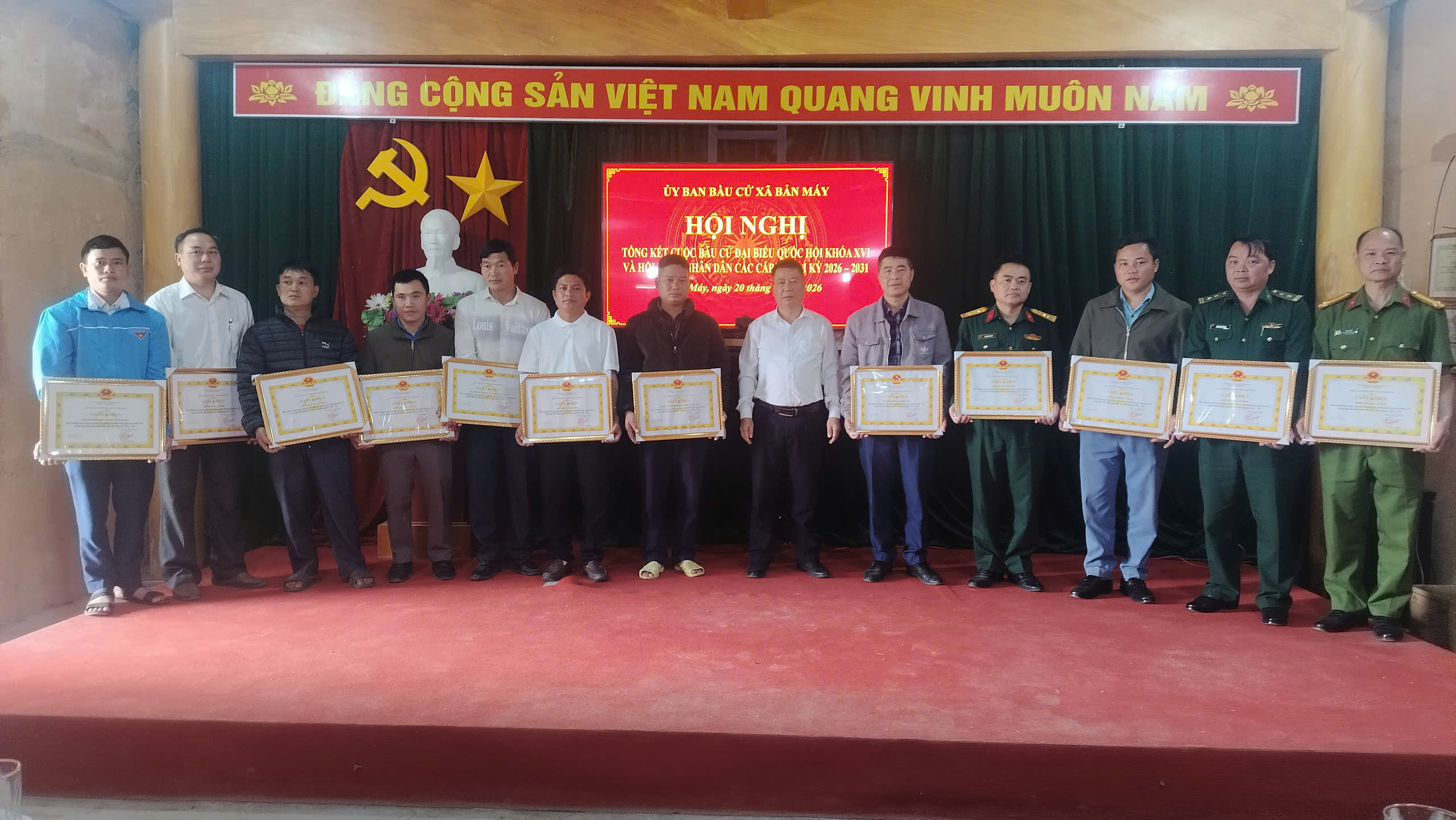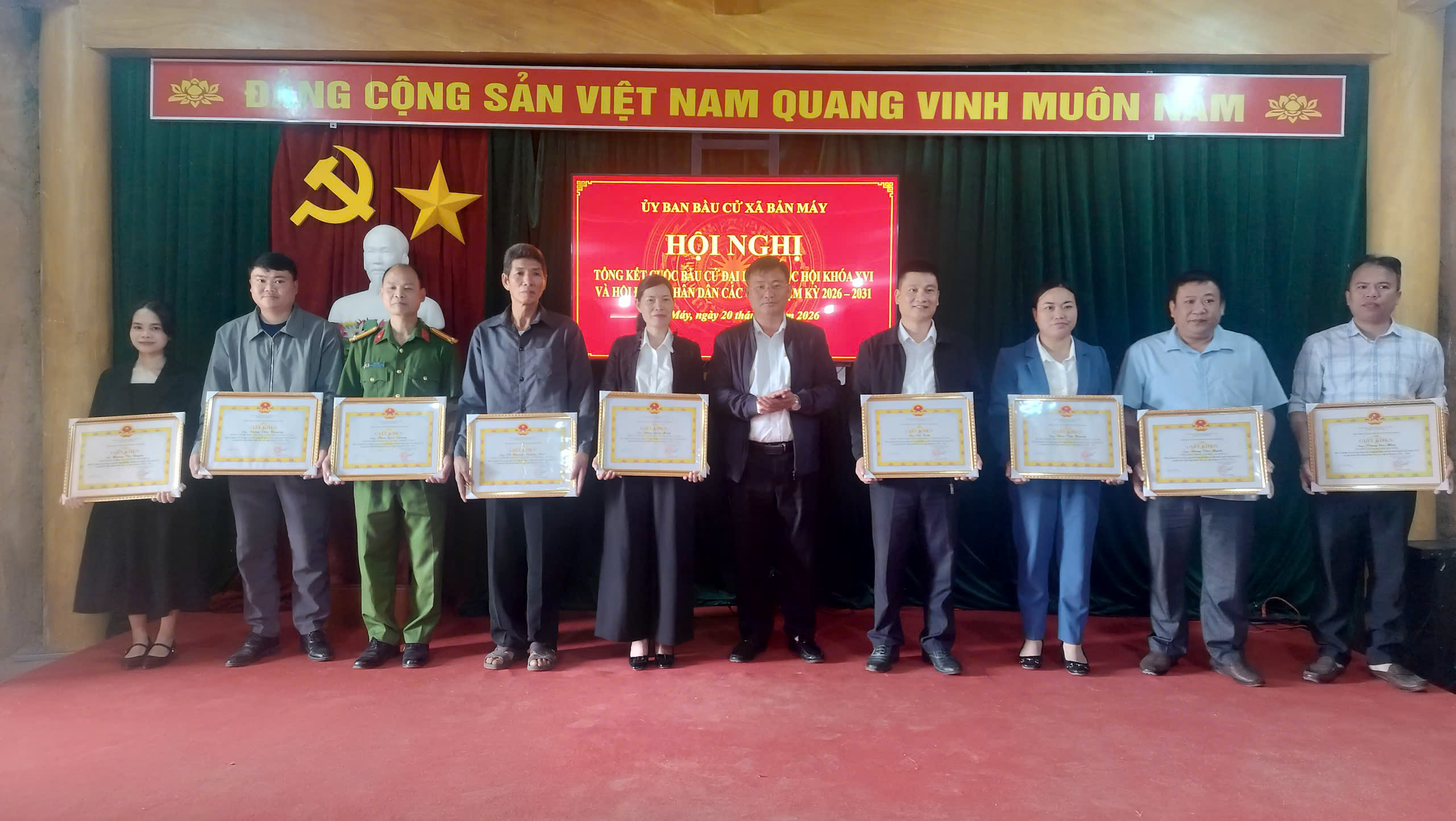 Nhân dịp này, UBND xã Bản Máy đã khen thưởng 12 tập thể và 30 cá nhân có thành tích xuất sắc trong công tác bầu cử đại biểu Quốc hội và đại biểu HĐND các cấp nhiệm kỳ 2026 – 2031